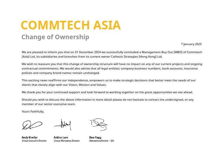 We are thrilled to share the news of our successful Management Buy Out (MBO) of Commtech (Asia) Ltd from our previous owners, marking a significant milestone in our journey. This new chapter empowers us with greater operational flexibility, enabling us to foster emerging talents and cultivate an entrepreneurial spirit within our organization.
